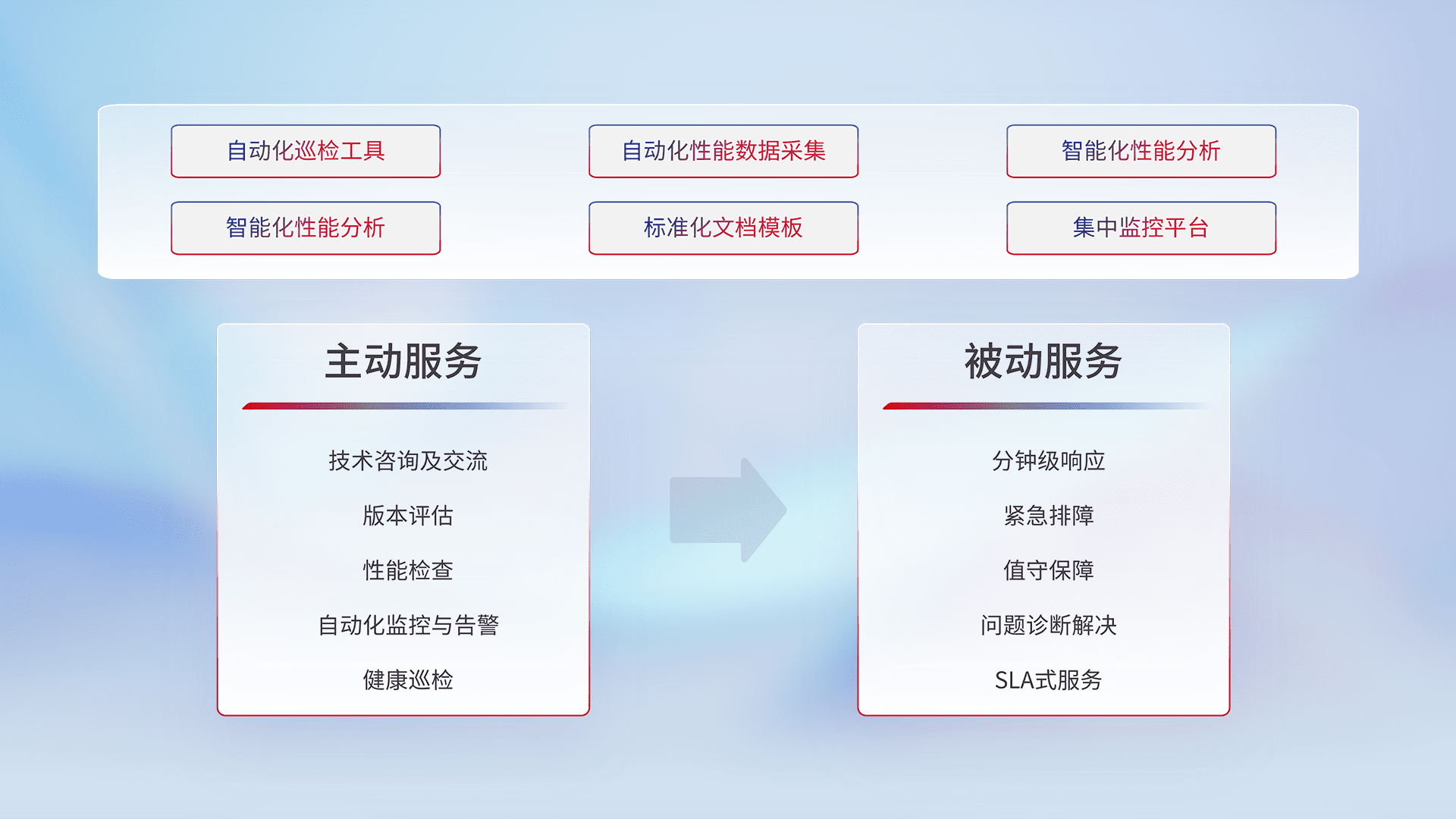 智能化工具和标准化文档,,保障服务质量,,提供主动服务(包含技术咨询、、、、版本评估、、、、性能检查、、、自动化监控与告警、、、、健康巡检)和被动服务包含(分钟级响应、、紧急排障、、、、值守保障、、、问题诊断解决、、SLA服务)。。。。